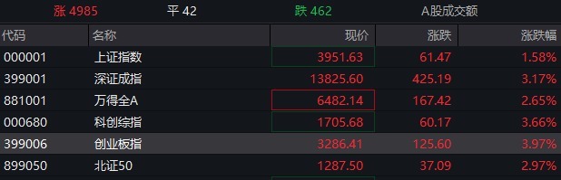 【大河财立方消息】4月8日,A股主要指数集体高开,创业板指盘中涨超4%。截至发稿,上证指数涨1.58%,深证成指涨3.17%,科创综指涨3.66%,创业板指涨3.97%,全市场近5000只个股上涨。