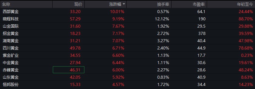 黄金股持续走强,西部黄金开盘一字涨停,山金国际盘中打开涨停板,晓程科技一度涨超10%,湖南黄金、湖南白银、紫金矿业、赤峰黄金、山东黄金跟涨。