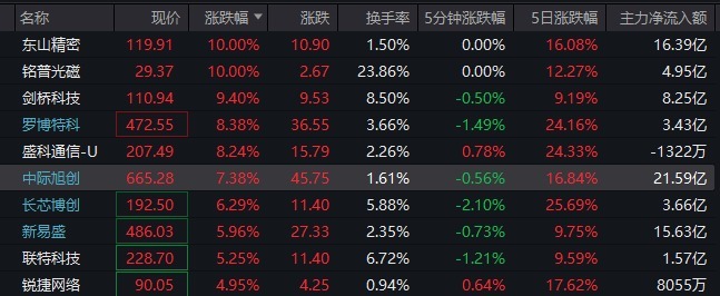 光模块板块大幅上涨,五大龙头股罗博特科、中际旭创、长芯博创、德科立、光库科技股价盘中齐创历史新高。中际旭创总市值突破7400亿元。东山精密、铭普光磁涨停。